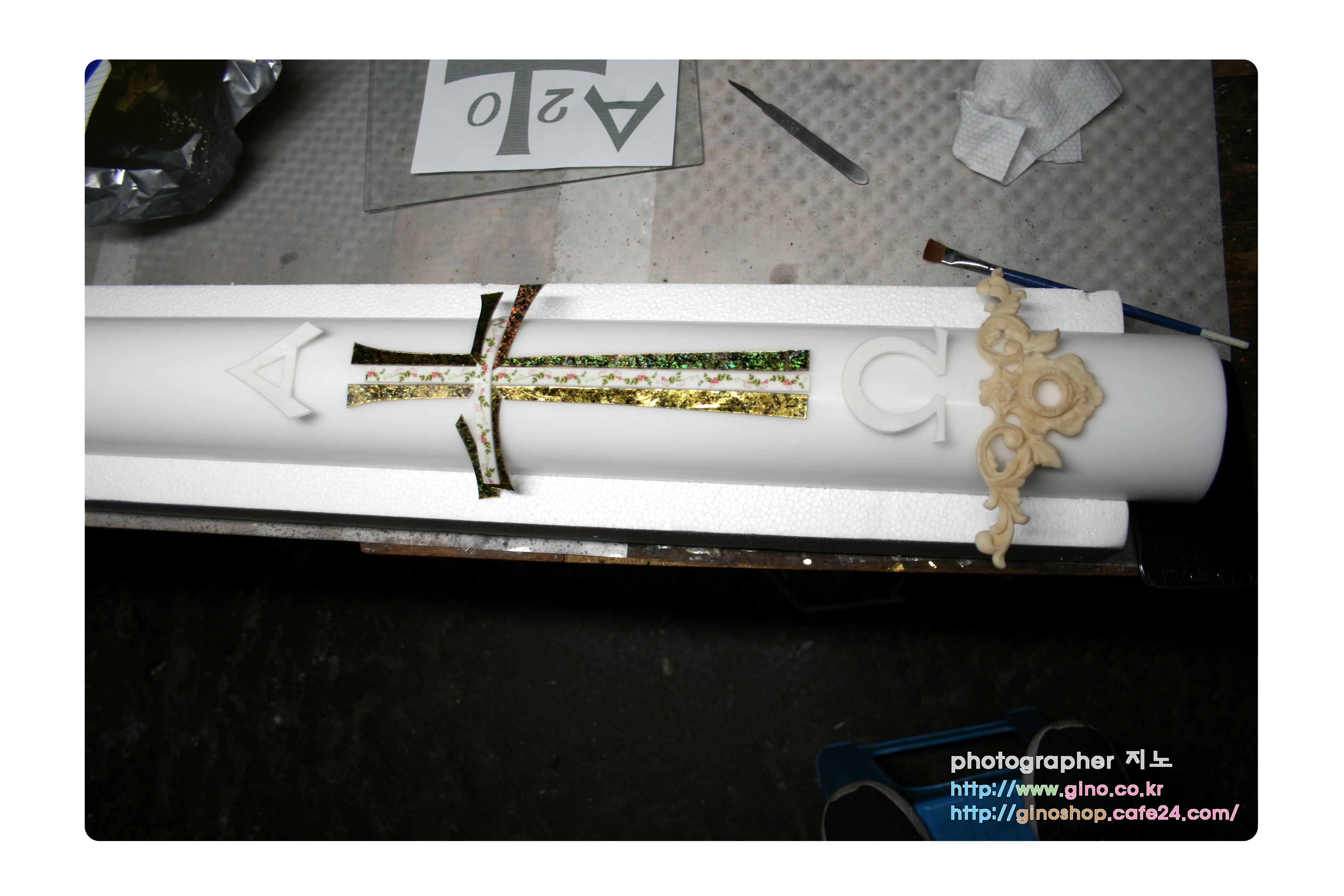 이제 최종 부활절 빠스카 양초 완성품을 선보여드릴 시간이 다가옵니다. 작업을 하면서 보완 해야 될 부분이 몇가지 발견이 되었는데요. 알파 윗부분이 뽀쪽해서 보기에 걸리신다는 의견을 주셔서 참조를 하여 수정 조취를 해보았습니다. 그 전에 빠스카 양초에 따 놓은 캔들 왁스 시트 도안들을 다 붙여두고, 알파와 오메가 테두리쪽에 적색 라인 시트로 테두리 포인트 작업을 먼저 해서 느낌을 보고 의견을 조율을 하였지만, 전체 적인 특히 십자가와 대조 된다는 느낌의 의견들이 많아서 다 뜯어 내고 다시 무광금박 줄 왁스 시트로 교체 수정을 하였습니다. 그리고 숫자는 금색으로 적용을 하였습니다. 이렇게 만들고 느낌을 보니 고전적인 느낌이 물신물신 풍겨나네요 .. 그래서 생각을 해둔 예수 조각상을 붙이고 채색 작업으로 최종 적인 느낌을 봅니다. 그런데 예수 조각상이 시각적으로 십자가에 뭍혀 버리는 느낌을 강하게 받게 됩니다. 이부분의 문제 해결을 해야 하는데 고민에 들어가게 됩니다.