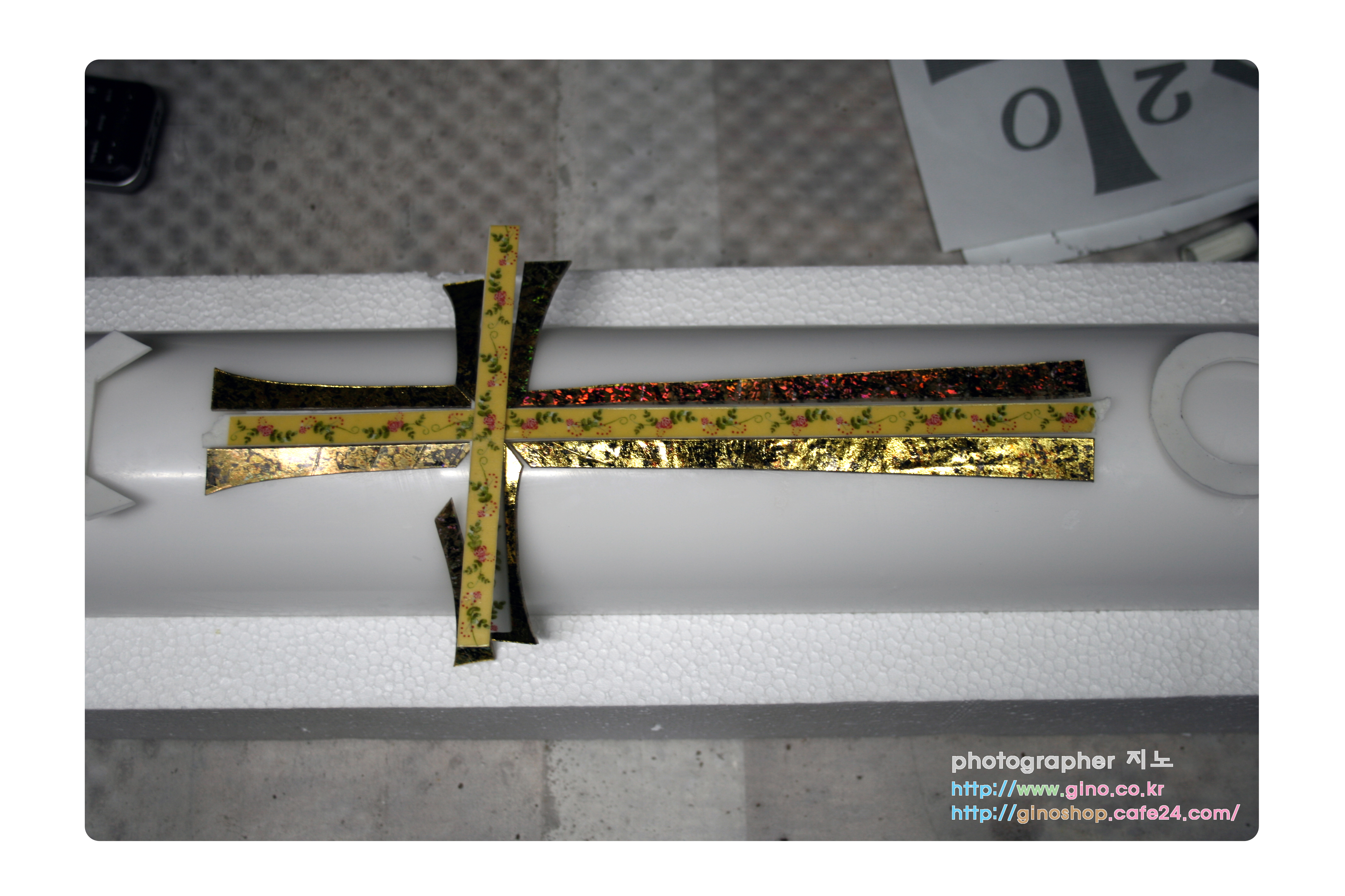 단점중에 단점인 저희가 가지고 있는 금박의 색톤에 뭍혀 생각했던 무늬가 나오지 않았다는 점입니다. 그래서 새로운 무늬를 바꾸고 만들어서 채택을 최종 선택한 것입니다. 또한 십자가의 다른 부분은 다른 광택 박으로 조합을 시켜서 부분별 다른 느낌으로 수정 조취를 하였습니다. 다만 이참에 새로운 양초 재료를 만들어두면 다른 제품 개발때 분명이 활용을 할수 있기때문에 부활 빠스카 양초 제품 출시에는 조금더 시간이 걸리겠지만, 긍정적이라고 생각을 가지고 수정 보완을 해나갑니다.