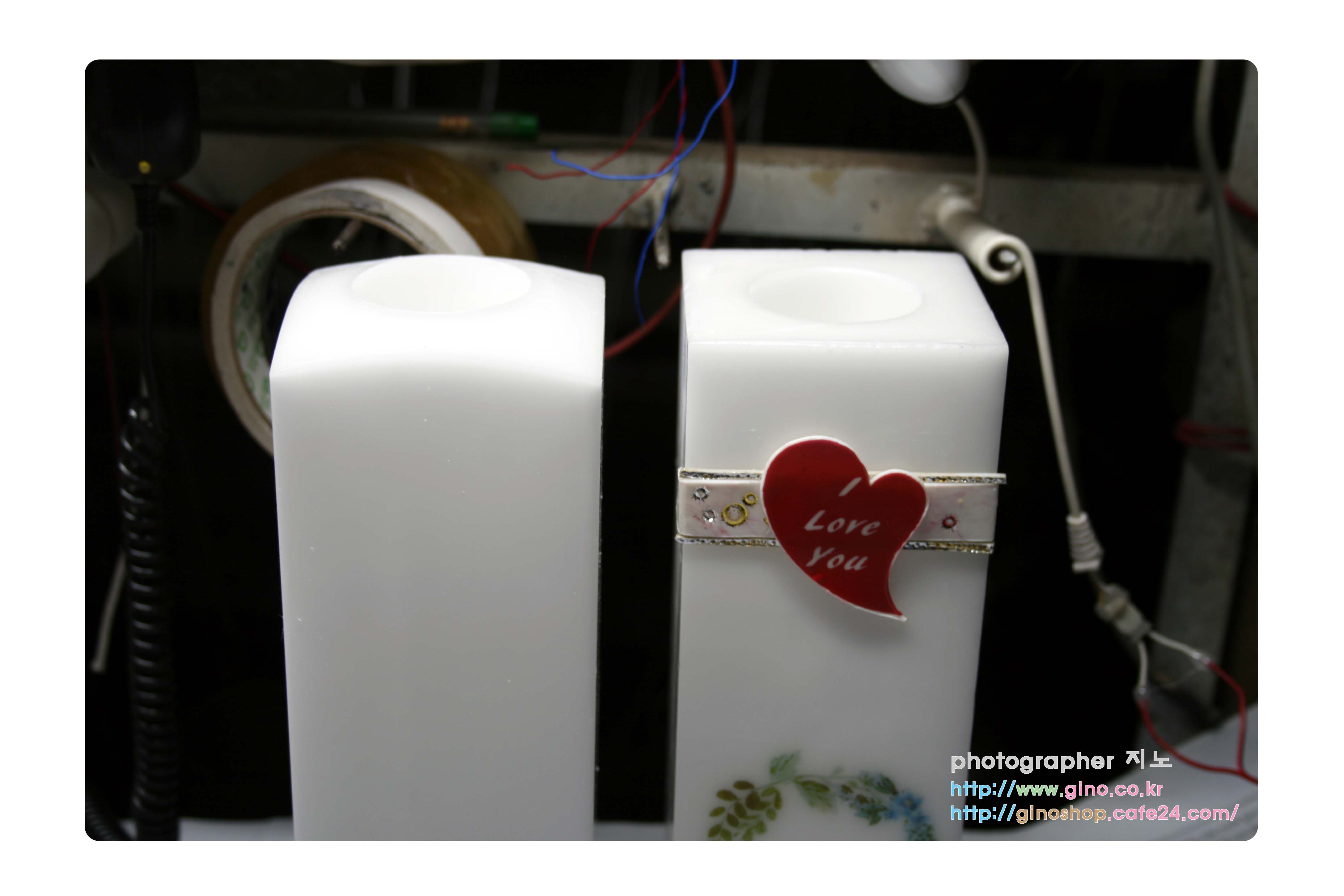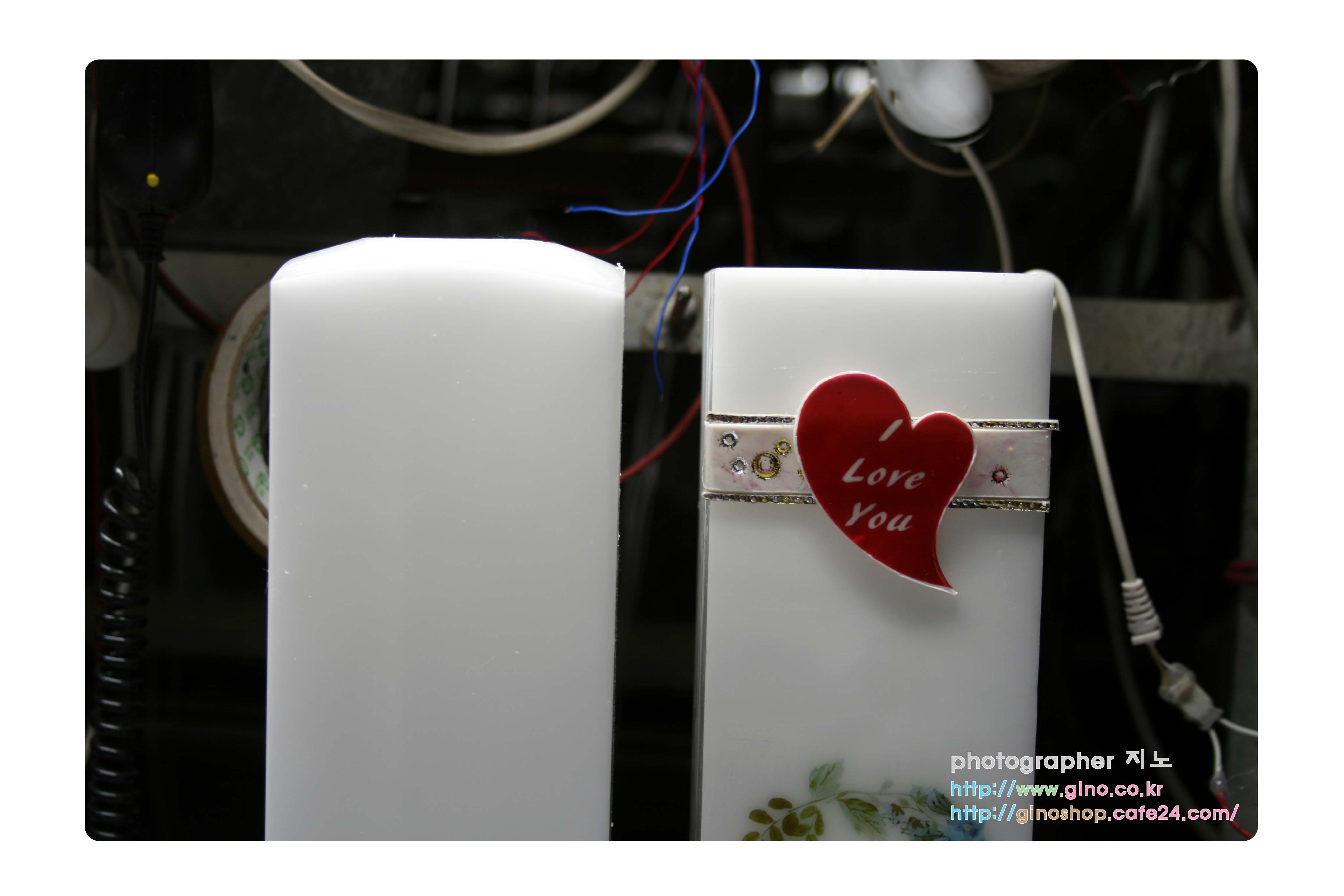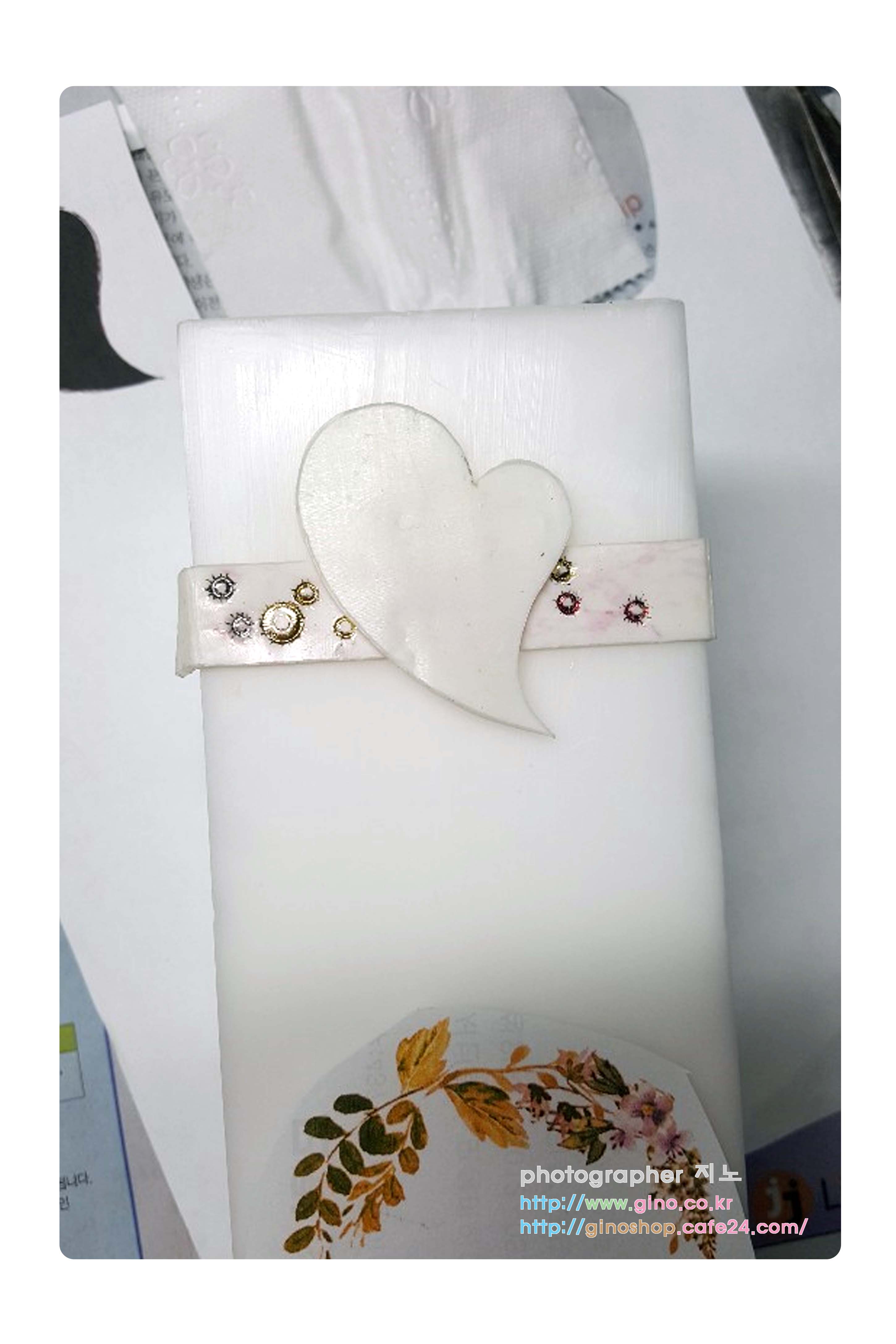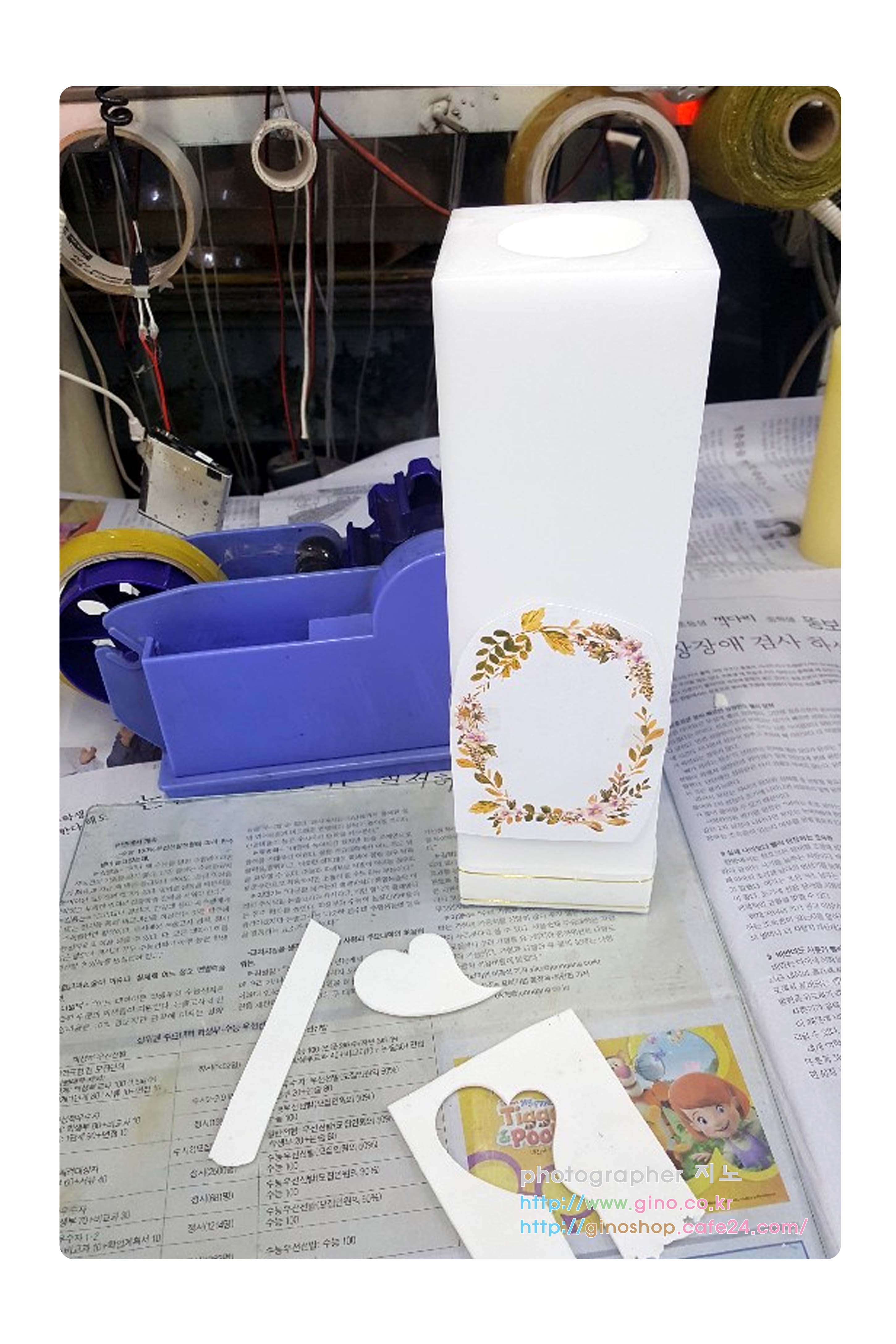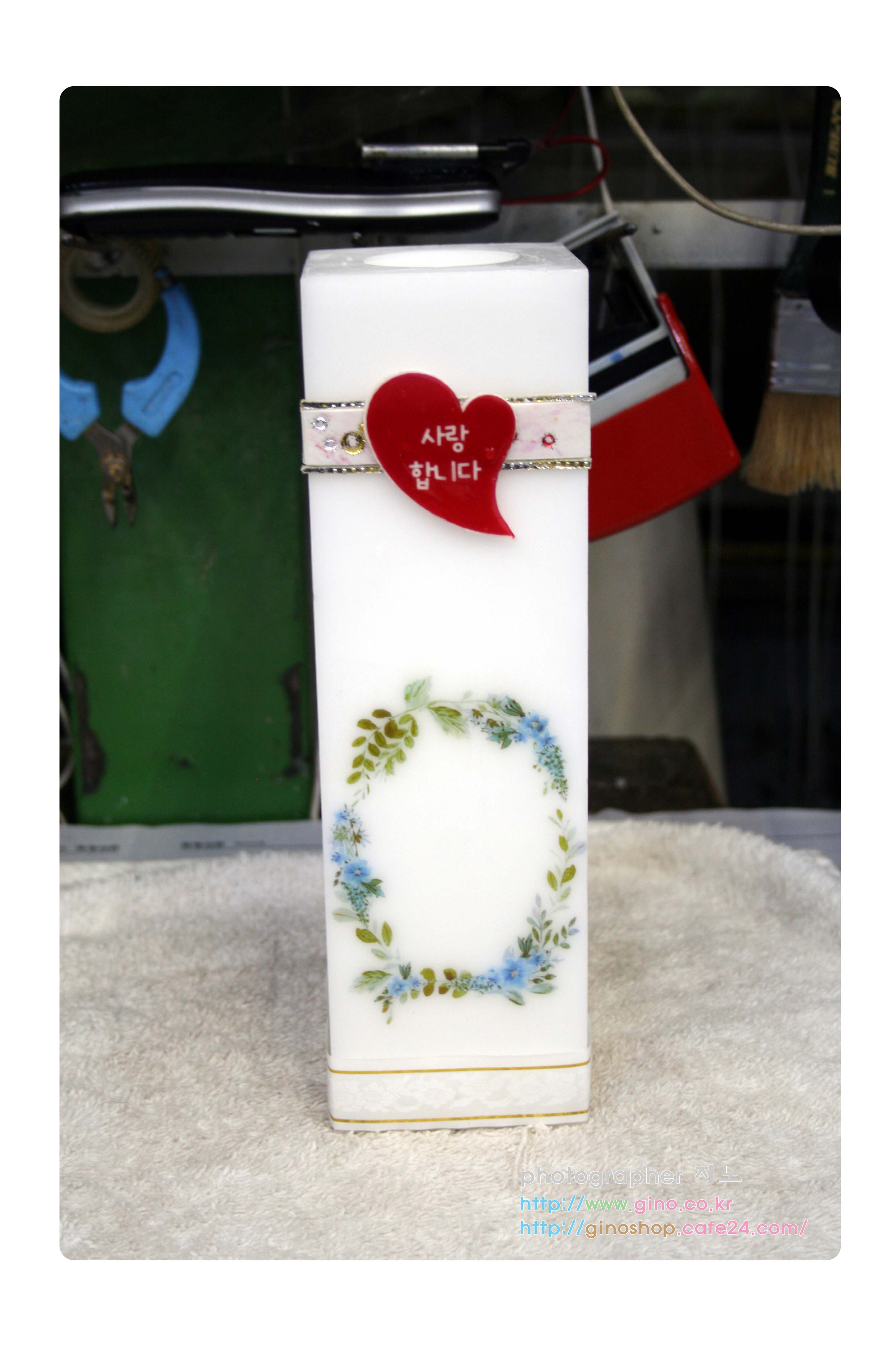 양초에 수정한 꽃 테두리를 인쇄를 하고 난다음 나머지 부수적 재료들을 붙여서 배열을 맞추어 나갑니다. 앞전 개발한 형틀로 만들 줄 캔들 왁스 시트를 라인으로 잘라서 테두리에 붙이고 하트에는 임의로 i love you 와 사랑합니다. 2가지 이벤트 문구를 인쇄를 하여 샘플 작업을 하였습니다. 다 완성된 제품에 하트안에는 원하시는 문구를 넣을수 있도록 옵션으로 잡을 예정이며, 다만 다 붙이고, 보니 캔들 라인 왁스 시트 부분이 사실 조화를 이루지 못하네요. 끈 모양으로 다시 배치를 해봐야 할듯합니다.