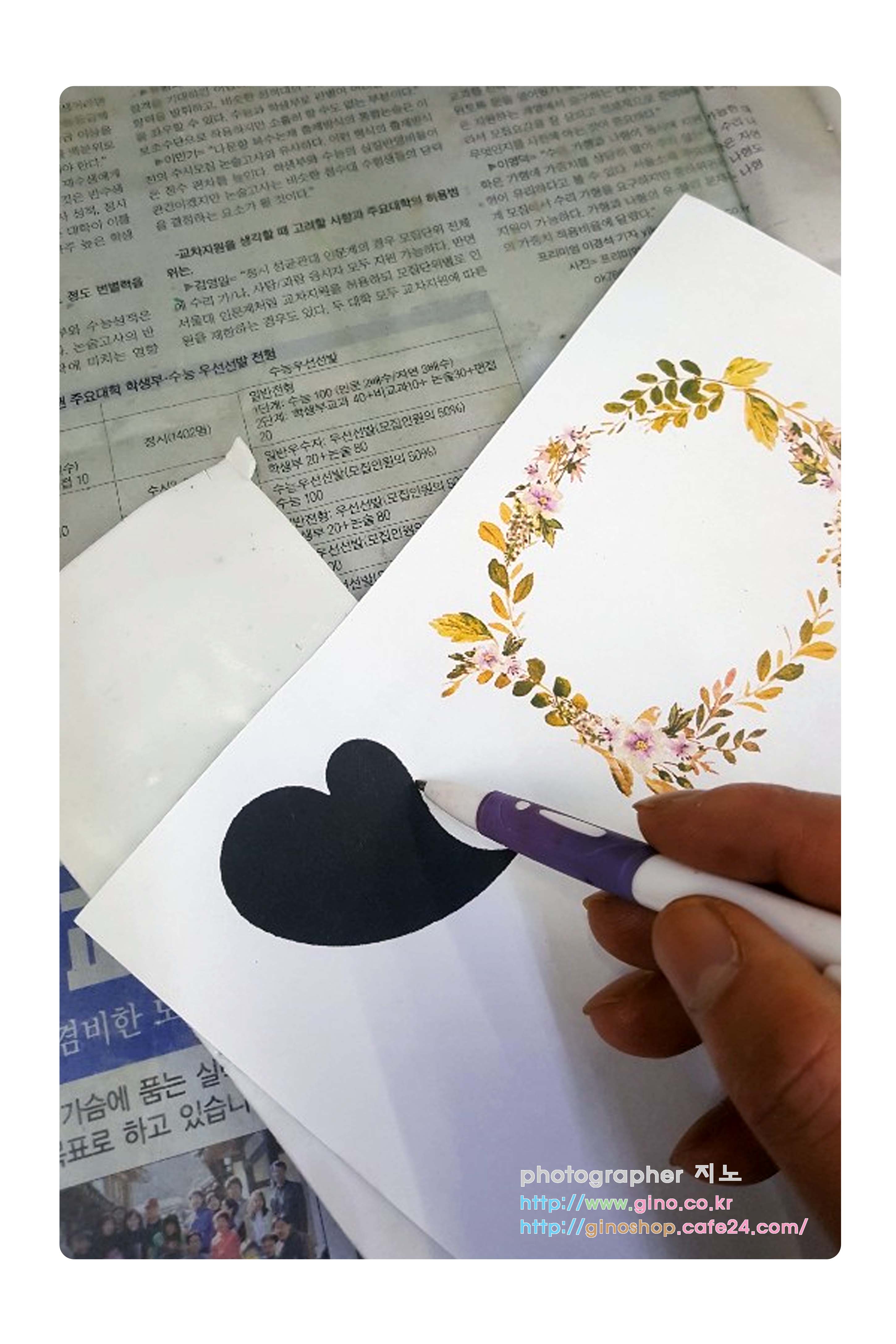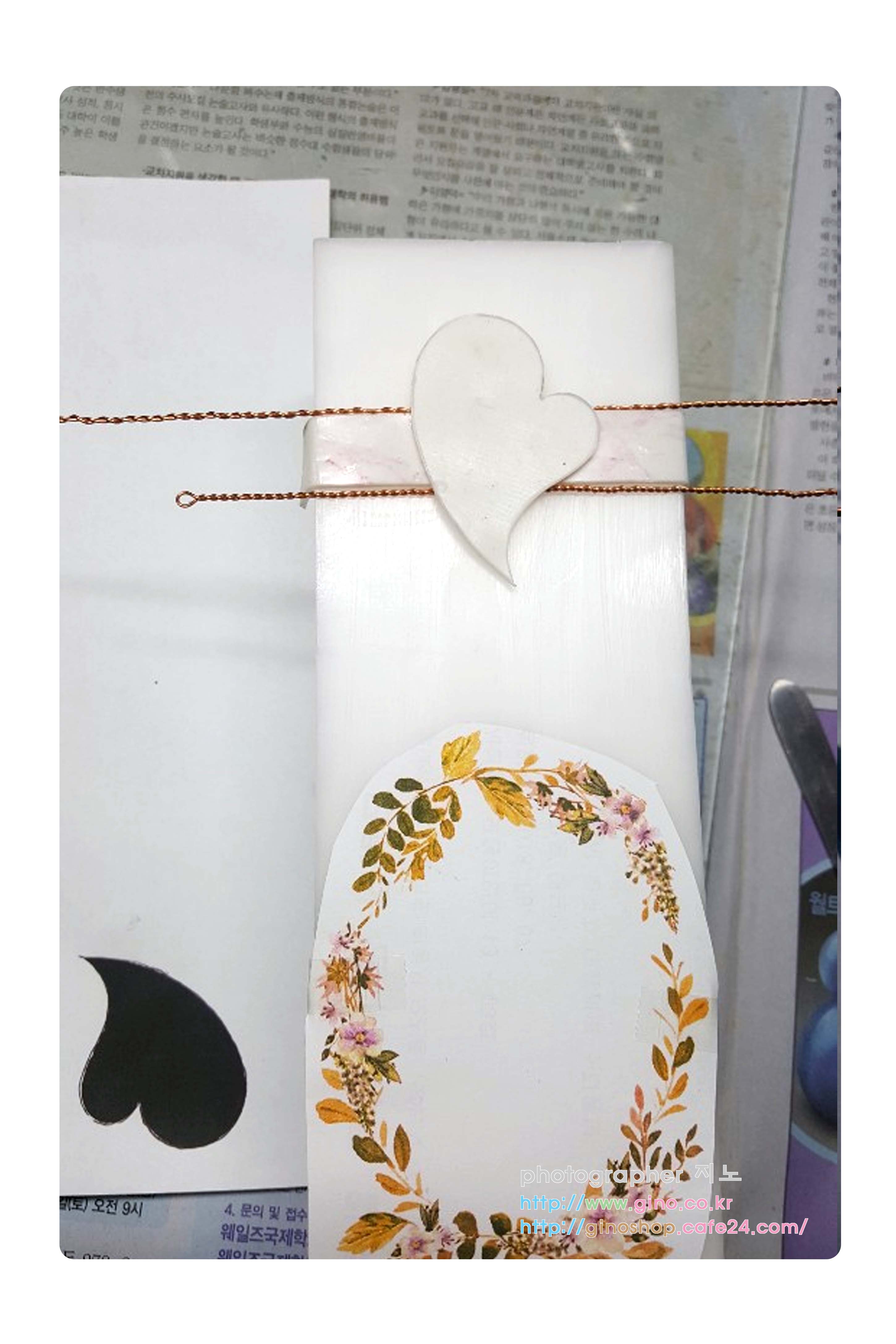 양초에 붙여질 샘플 재료들을 만들어 나갑니다. 먼저 앞전 시안의 테두리 부분을 수집한 자료를 조합하여 이미지 보완 작업을 해주고, 화이트 왁스 시트로 하트 부분은 컷팅하여 준비를 해줍니다, 그리고 하트 뒷부분 테두리 부분의 새로운