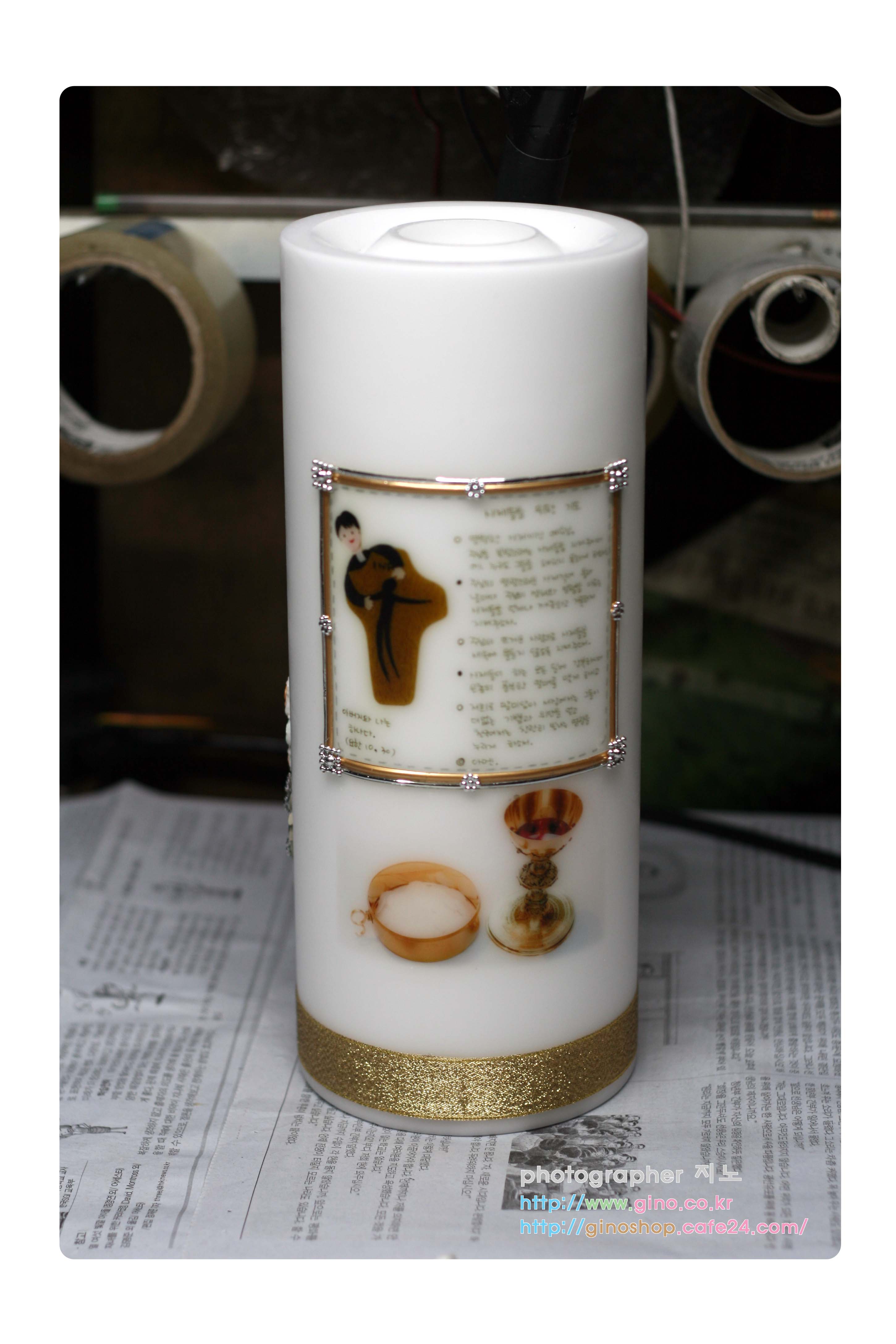 원하시는 이미지와 사제를위한기도문을 넣어 주문 제작을 하신 캔들 입니다.