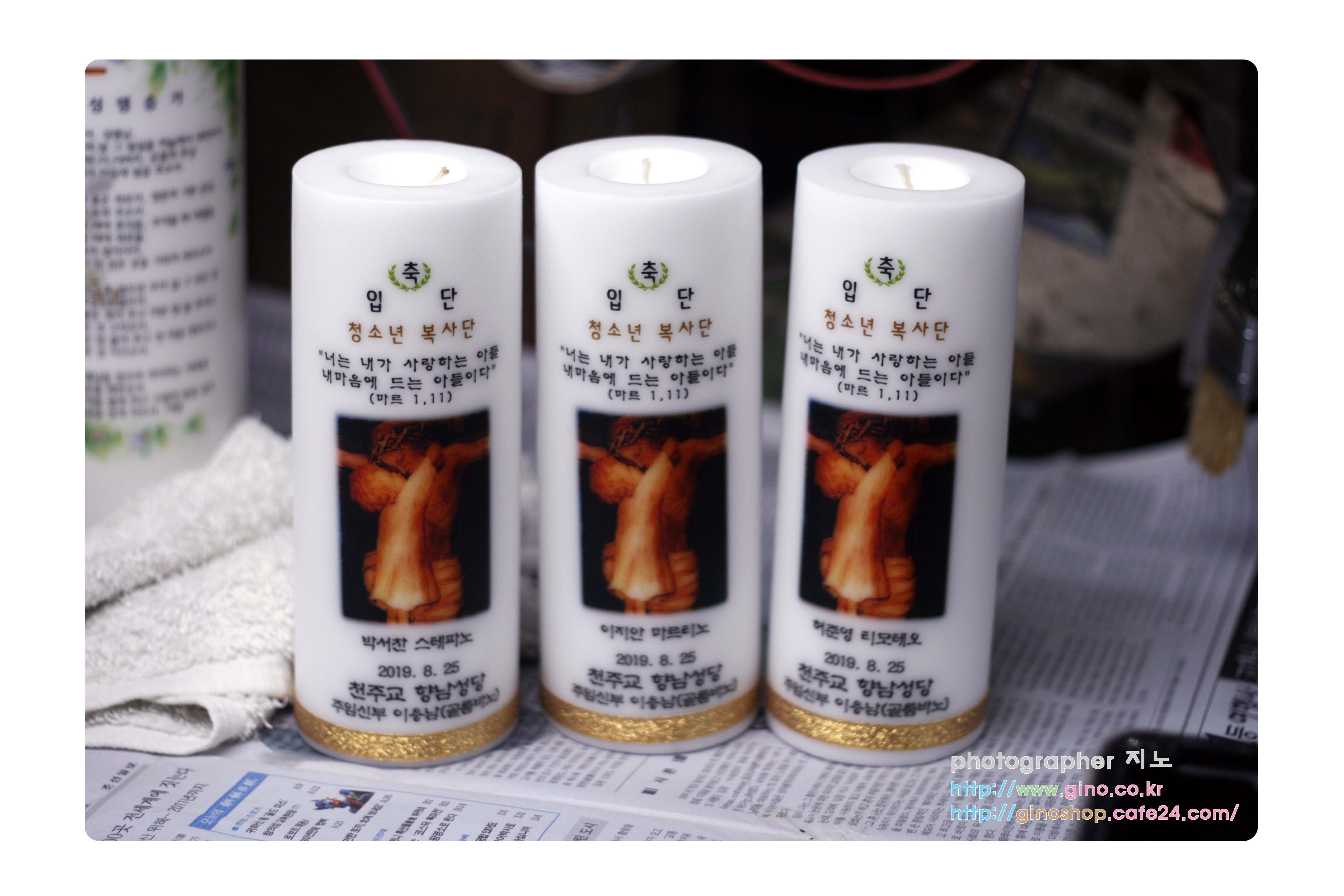 향남성당 청소년 복사단에서 축입단 행사때 사용하기 위해서 복사단 개별 이름을 넣어 주문 제작을 하신 캔들 입니다.