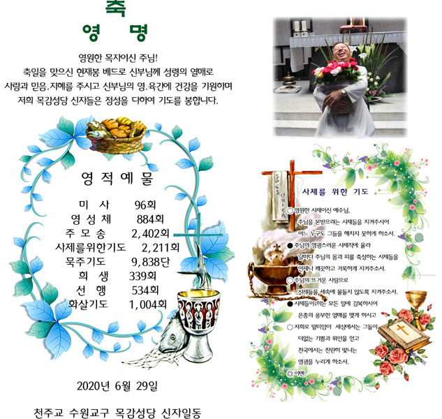 영원한 목자이신 주님! 축일을 맞으신 현재봉 베드로 신부님께 성령의 열매로 사랑과 믿음.지혜를 주시고 신부님의 영.육간에 건강을 기원하며 저희 목감성당 신자들은 정성을 다하여 기도를 봉합니다.