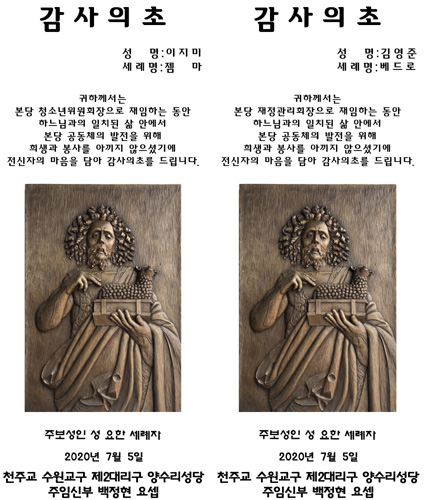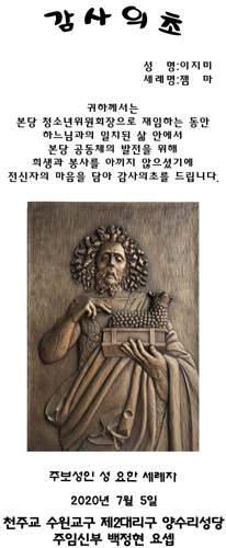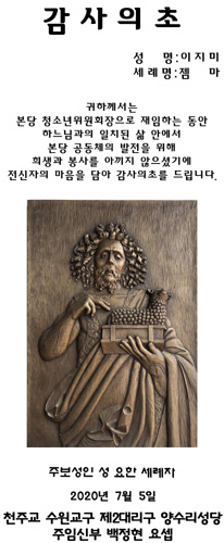 귀하께서는 본당 청소년위원회장으로 재임하는 동안 하느님과의 일치된 삶 안에서 본당 공동체의 발전을 위해 희생과 봉사를 아끼지 않으셨기에 전신자의 마음을 담아 감사의초를 드립니다.