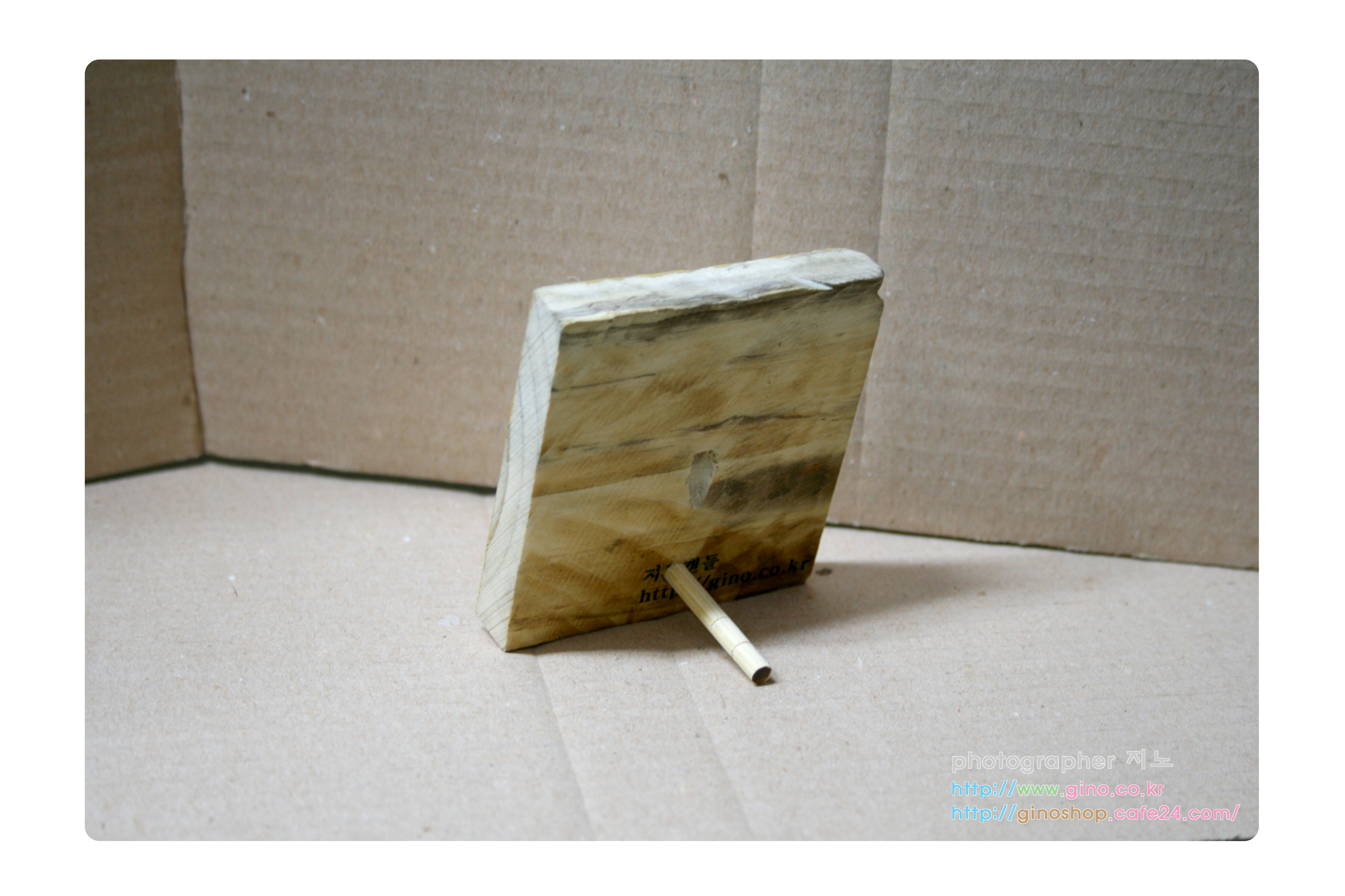 그리고 뒷면에는 저희 지노캔들 홈페이지를 하단에 마킹을 해준다음, 액자 받침을 어떻게 할것인가를 고민 하였는데, 수리로 된 받침을 할까도 생각을 하다가 원가 상승이기때문에 다른곳의 액자 상품을 보니 나무 막대기로 끼워서 하는것을 보고 중앙에 비스듬이 뚤어서 나무 젓가락을 활용해 해보았지만, 역시 문제점을 발견을 하게 됩니다.