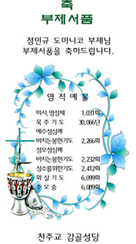 정민규 도미니코 학사님 부제서품을 진심으로 축하 드리며, 영육간의 건강을 위하여 우리의 정성을 담아 영적예물을 봉헌 합니다.
