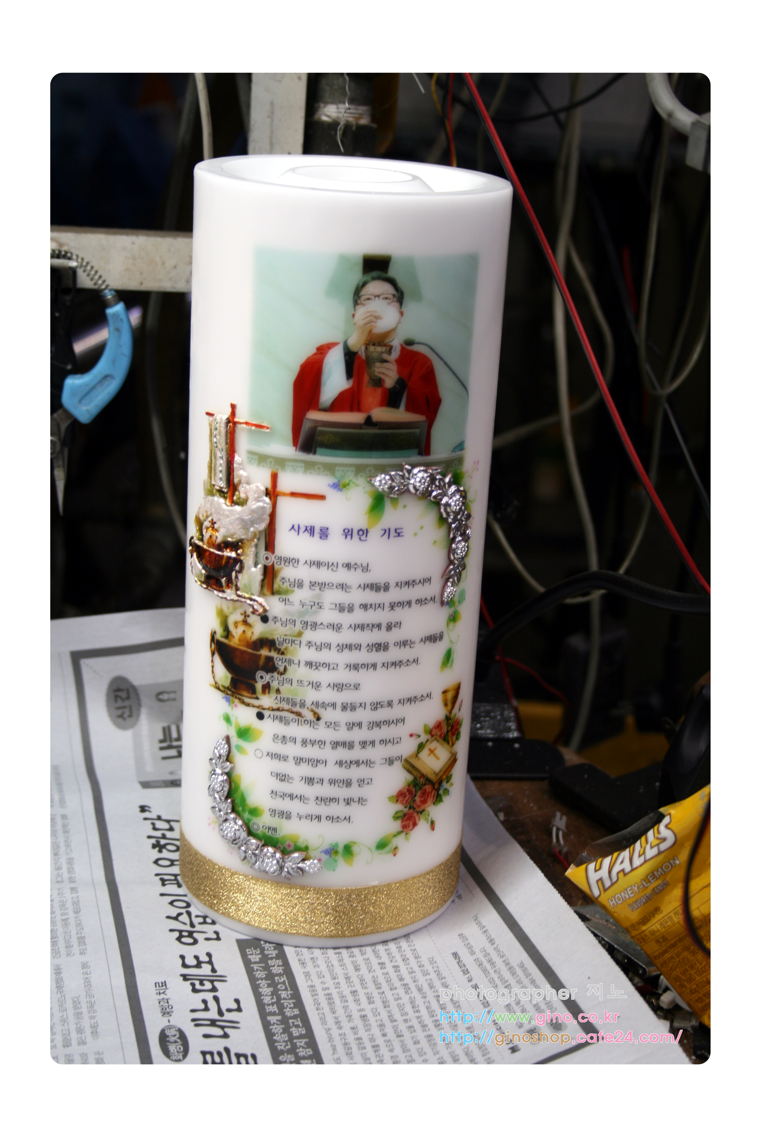 요번에 새롭게 조각하여 디자인해본 영명축일 양초입니다. 디자인의 패턴이 거이 비슷하게 은박장이 왁스 시트를 이용하거나 자주 사용하는 꽃장식으로 매번 약간의 구도만 바꾸어서 선보였습니다. 바탕의 이미지만 다르게 하였지만, 작업 완성후 거이 비슷한 디자인 구도라 자주보는 식상함 및 새로운것을 보여드리기 위해서 이제서야 보여드립니다.