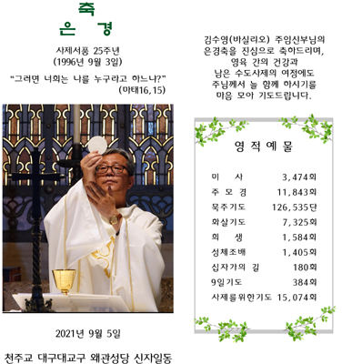 김수영(바실리오) 주임신부님의 은경축을 진심으로 축하드리며,