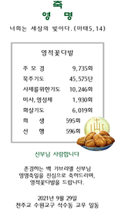 주 모 경 9,735회 묵주기도 45,575단 사제를위한기도 10,246회 미사,영성체 1,930회 화살기도 6,019회 희 생 595회 선 행 596회