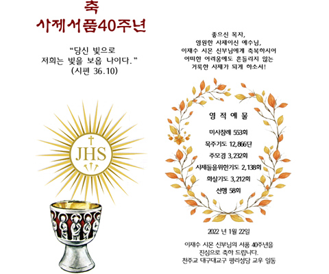 이재수 시몬 신부님의 서품 40주년을 진심으로 축하 드립니다.