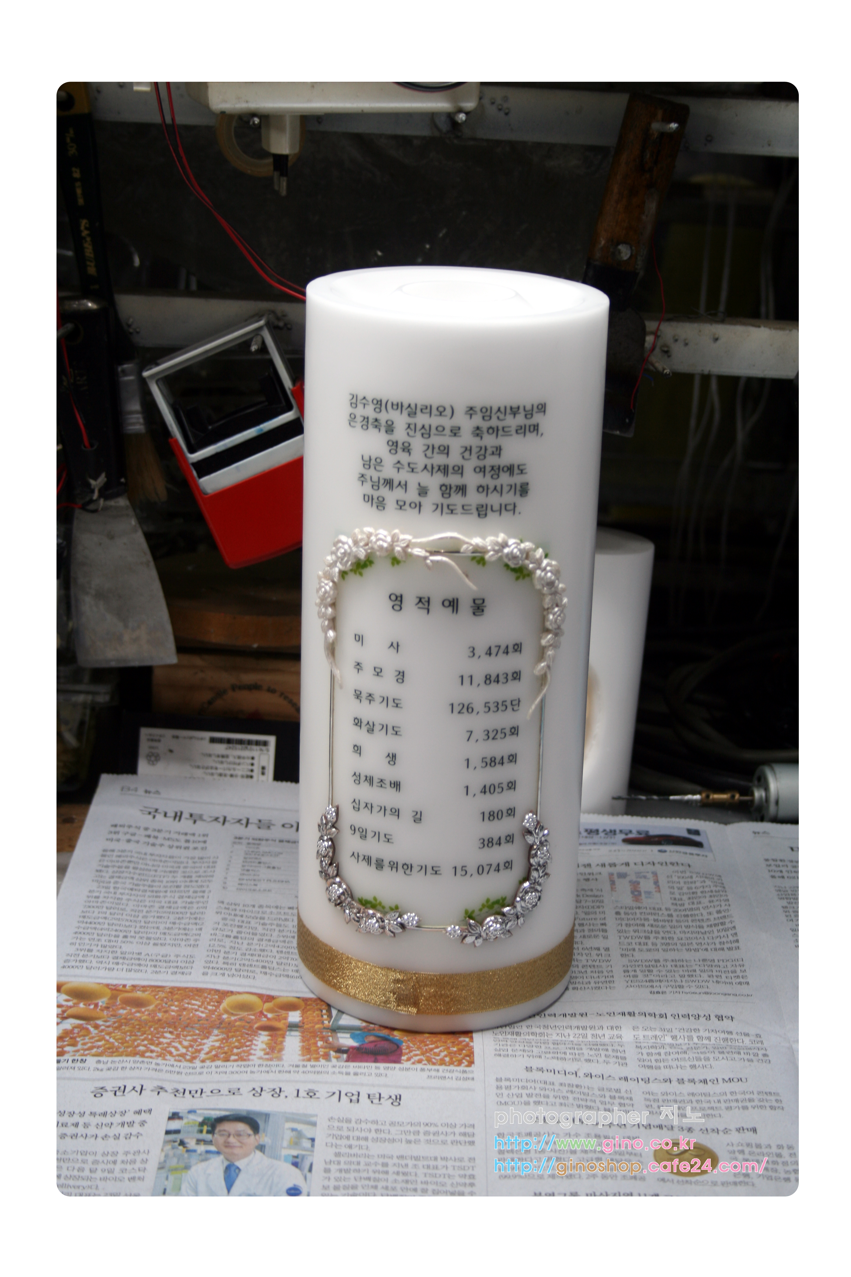 대구대교구 왜관성당에서 김수영(바실리오)신부님의 은경축일을 맡이하여 전신자분들의 정성스런 영적예물을 담아 주문 제작을 하신 축은경 양초 캔들 입니다.