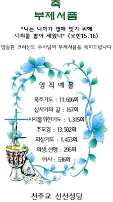 묵주기도 : 11,606회 십자가의 길 : 167회 사제를위한기도 : 1,315회 주모경 : 13,502회 화살기도 : 1,453회 희생,선행 : 296회 미사 : 536회