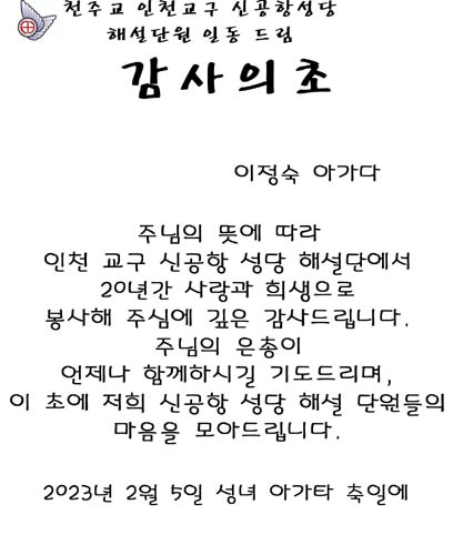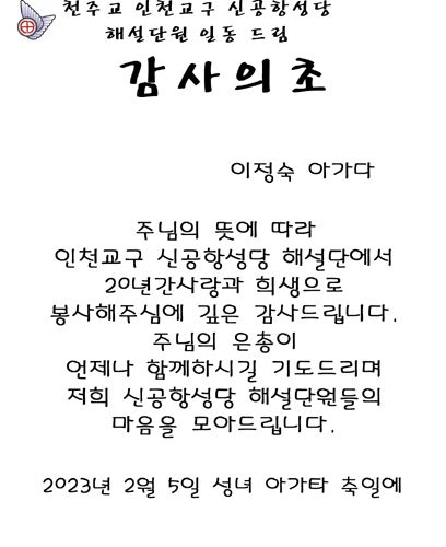 주님의 뜻에 따라  인천교구 신공항성당 해설단에서  20년간사랑과 희생으로 봉사해주심에 깊은 감사드립니다.  주님의 은총이 언제나 함께하시길 기도드리며 저희 신공항성당 해설단원들의  마음을 모아드립니다.