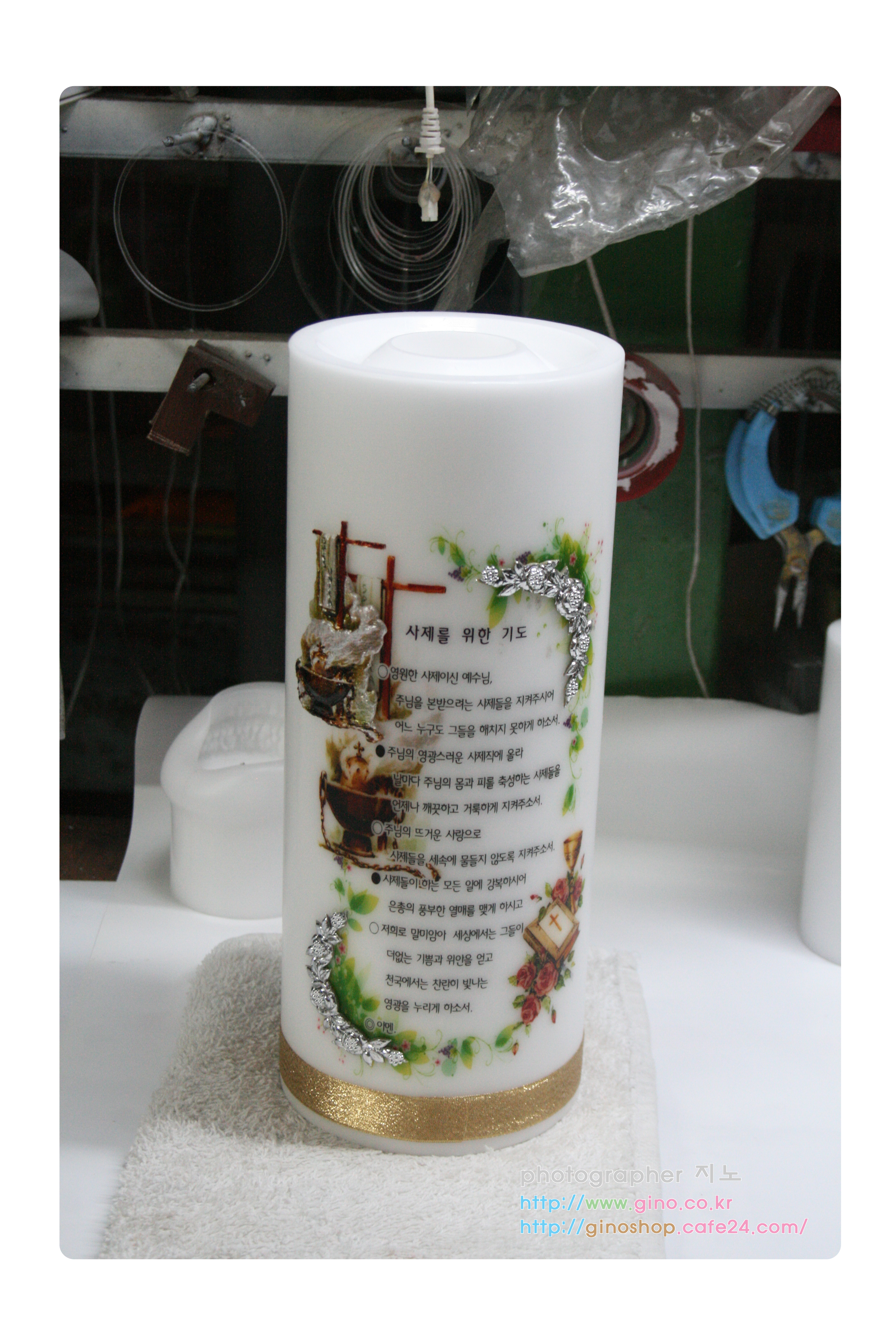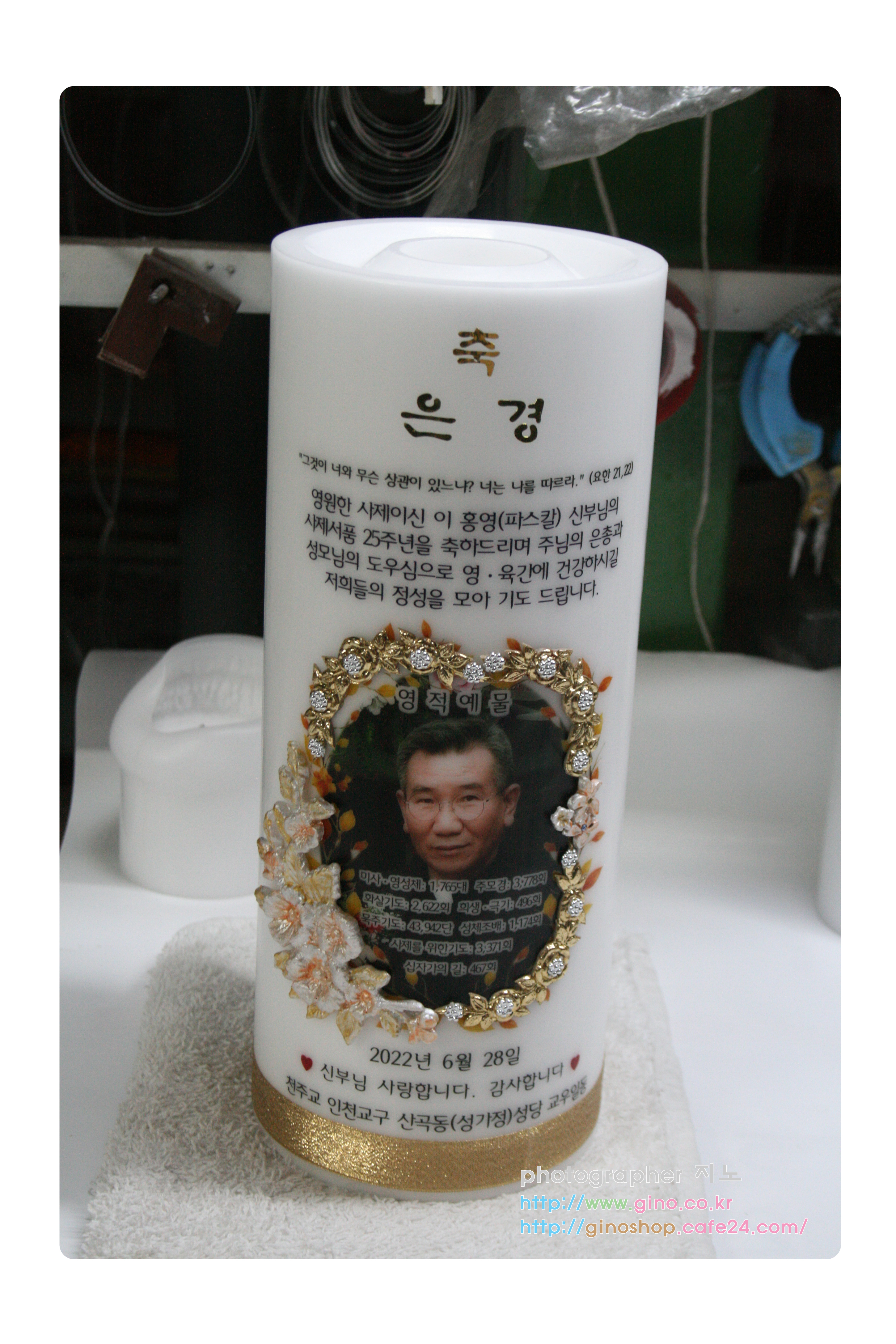 인천교구 산곡동(성가정)성당에서 이홍영(파스칼)신부님의 사제서품 25주년 은경축 기념 선물로 정성스런 영적예물을 담아 주문 제작을 하신 양초 캔들 입니다.