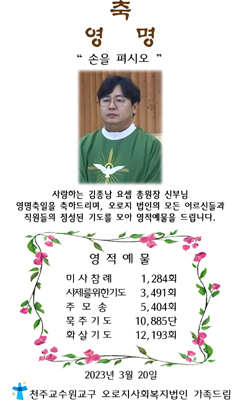 사랑하는 김종남 요셉 총원장 신부님! 영명축일을 축하드리며, 오목천동성당 모든 교우들의 정성된 기도를 모아 영적에물을 드립니다.