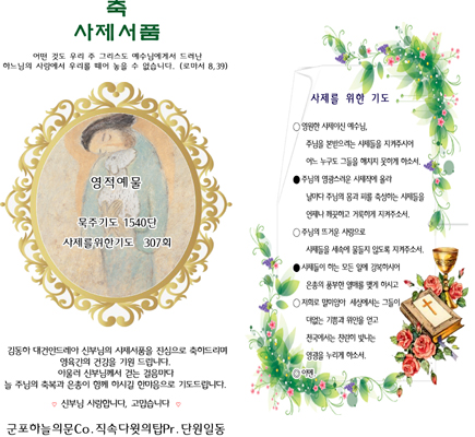 김동하 대건안드레아 신부님의 사제서품을 진심으로 축하드리며 영육간의 건강을 기원 드립니다. 아울러 신부님께서 걷는 걸음마다 늘 주님의 축복과 은총이 함께 하시길 한마음으로 기도드립니다.