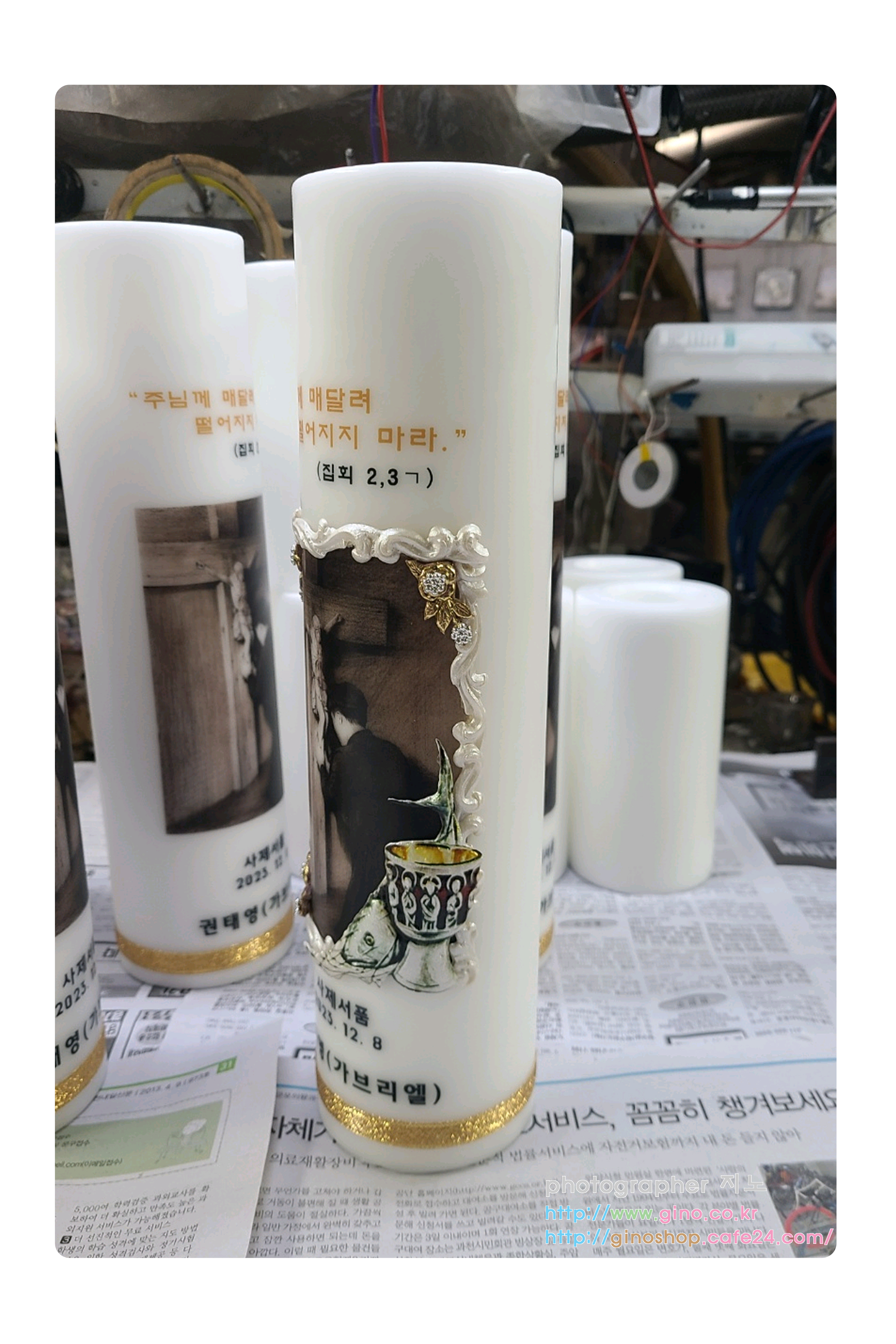 새롭게 디자인하여 만들어본 견본 세제서품 양초 샘플이 완성이 되었습니다. 이번에 수원교구 사제서품 하시는 부제서품 제대용 장식초가 의뢰가 들어와서 이참에 새롭게 만들어본 장식도 적용하여 upgrade 적용을 해봅니다. 각 단체별 사제서품식때 사용되는 초를 요 디자인과 아니면 예전 디자인중 선택을 해서 원하시는 쪽으로 만들어 드릴것입니다.