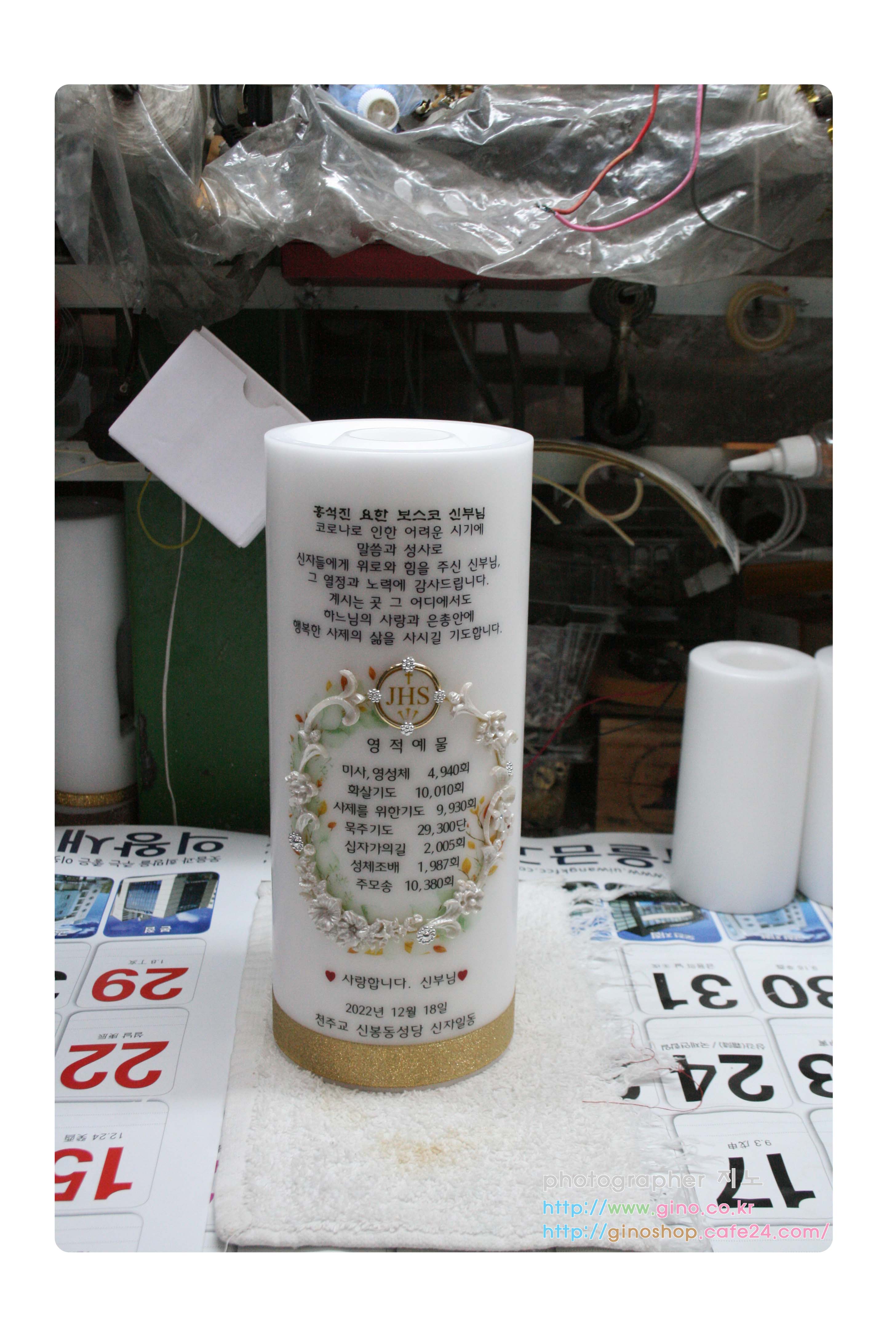 신봉동성당에서 어려운 시기에 홍석진(요한 보스코)신부님께서 신자들에게 위로와 힘을 주셔서 감사의 내용과 정성스런 영적예물을 담아 주문 제작을 하신 감사의초 양초 캔들 입니다.