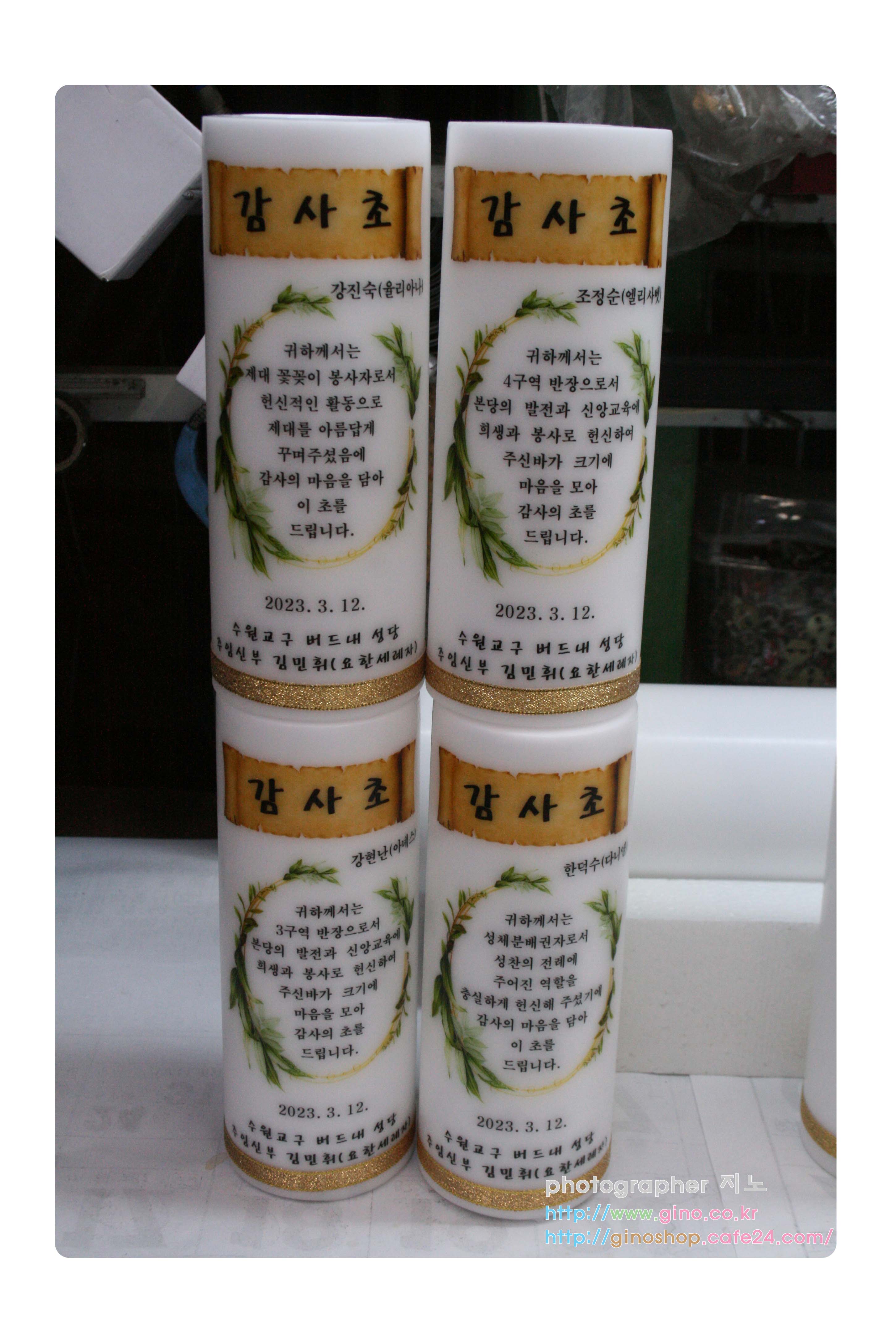 본당 발전과 신앙교육에 희생과 봉사의 헌적의 감사의 내용을 담아 주문 제작을 하신 감사초 양초 캔들 입니다